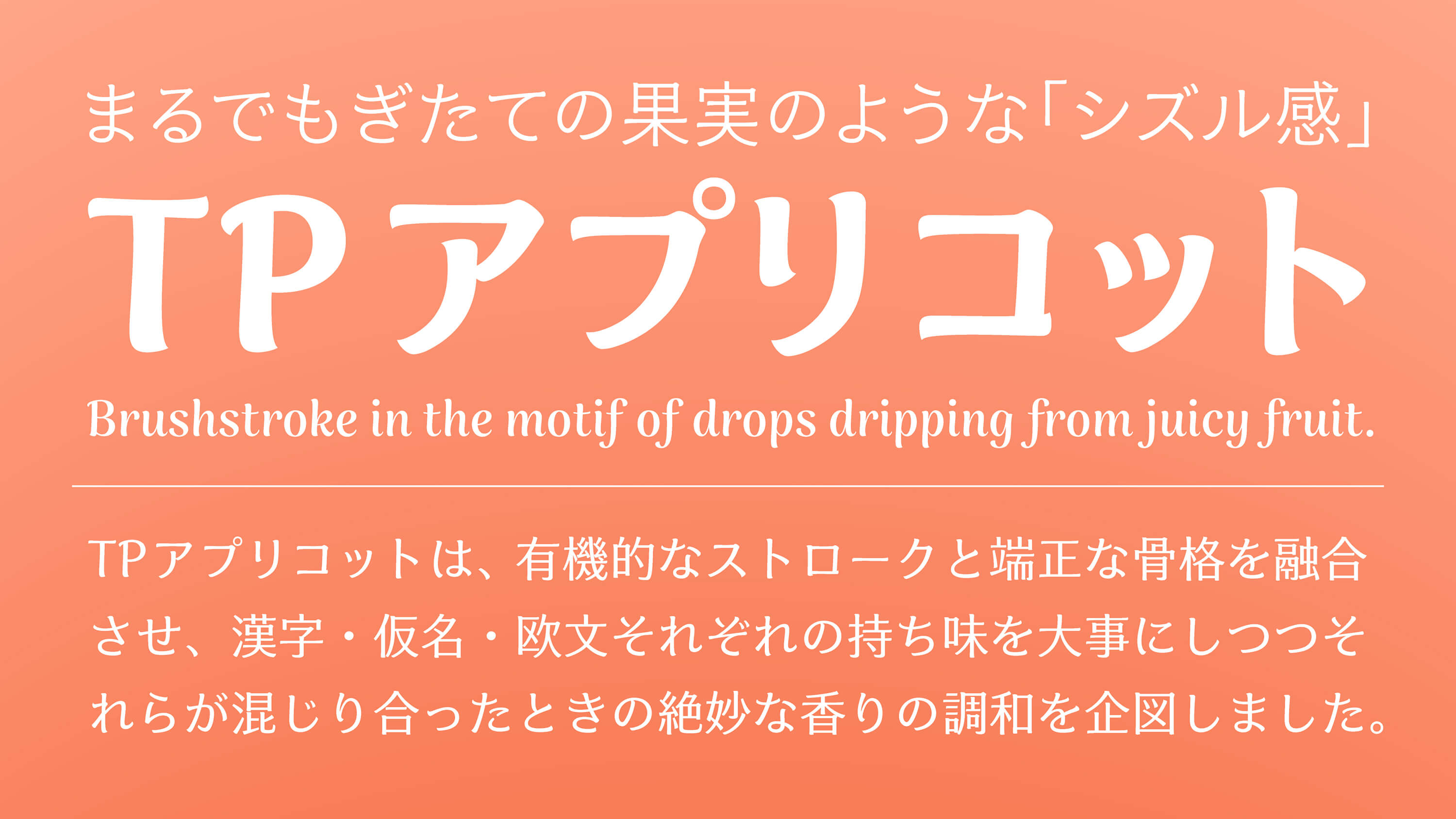 抑揚のある線質と丸みを帯びたパーツが、TPアプリコットの持ち味です。筆やフェルトペンなどの筆記具で描く線を想起させる形状を随所に取り入れ、親しみやすさのある文字に仕上げました。ふっくらとした起筆・終筆の形は、みずみずしい果実からしたたる雫をモチーフに、筆圧の変化による線幅やインクの流れを反映させたデザインです。縦横のストロークにはS字状の緩やかなカーブを持たせ、ゆっくり線を引くときの手と筆記具の滑らかな動きを表現しています。画数の少ない欧文や仮名では起筆・終筆の膨らみなどのメリハリを強め、線の混み合う漢字では抑揚を抑えることで、書体全体のバランスを整えています。
