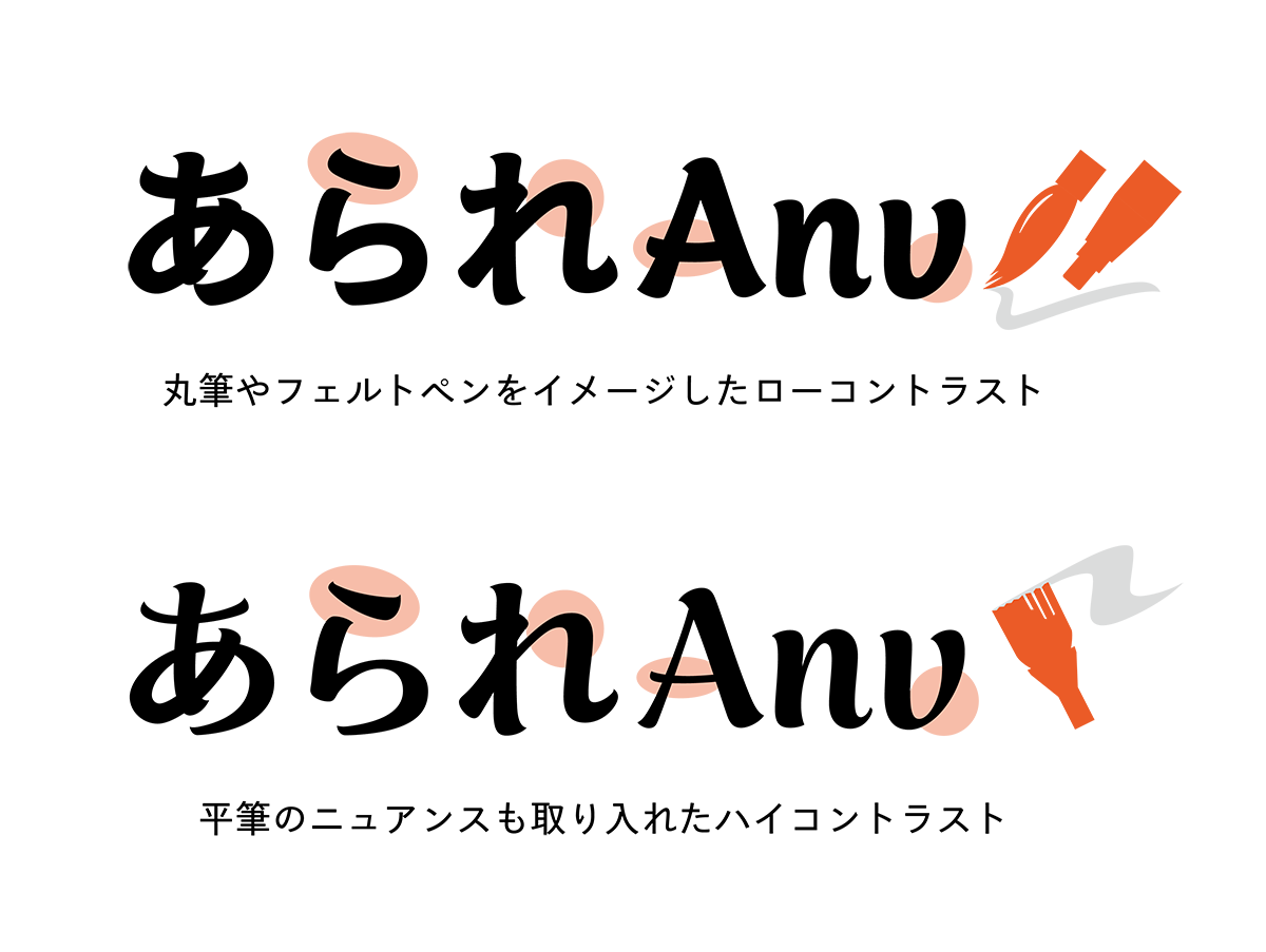 TPアプリコットには3つのコントラストのバリエーションがあり、いずれも手書きの風合いを持たせていますが、モチーフとしている筆記具やデザインのニュアンスはそれぞれ異なります。フェルトペンや丸筆で描く線をイメージしたローコントラストは親しみやすい印象を持ち、平筆のニュアンスも取り入れたハイコントラストは、やわらかさの中にもエレガントな雰囲気を纏っています。ローコントラスト・ミドルコントラストは、ユニークなデザインでありながら小さいサイズでも読みやすく、ハイコントラストは大きいサイズで使用することで華やかさを演出できる仕上がりになっています。