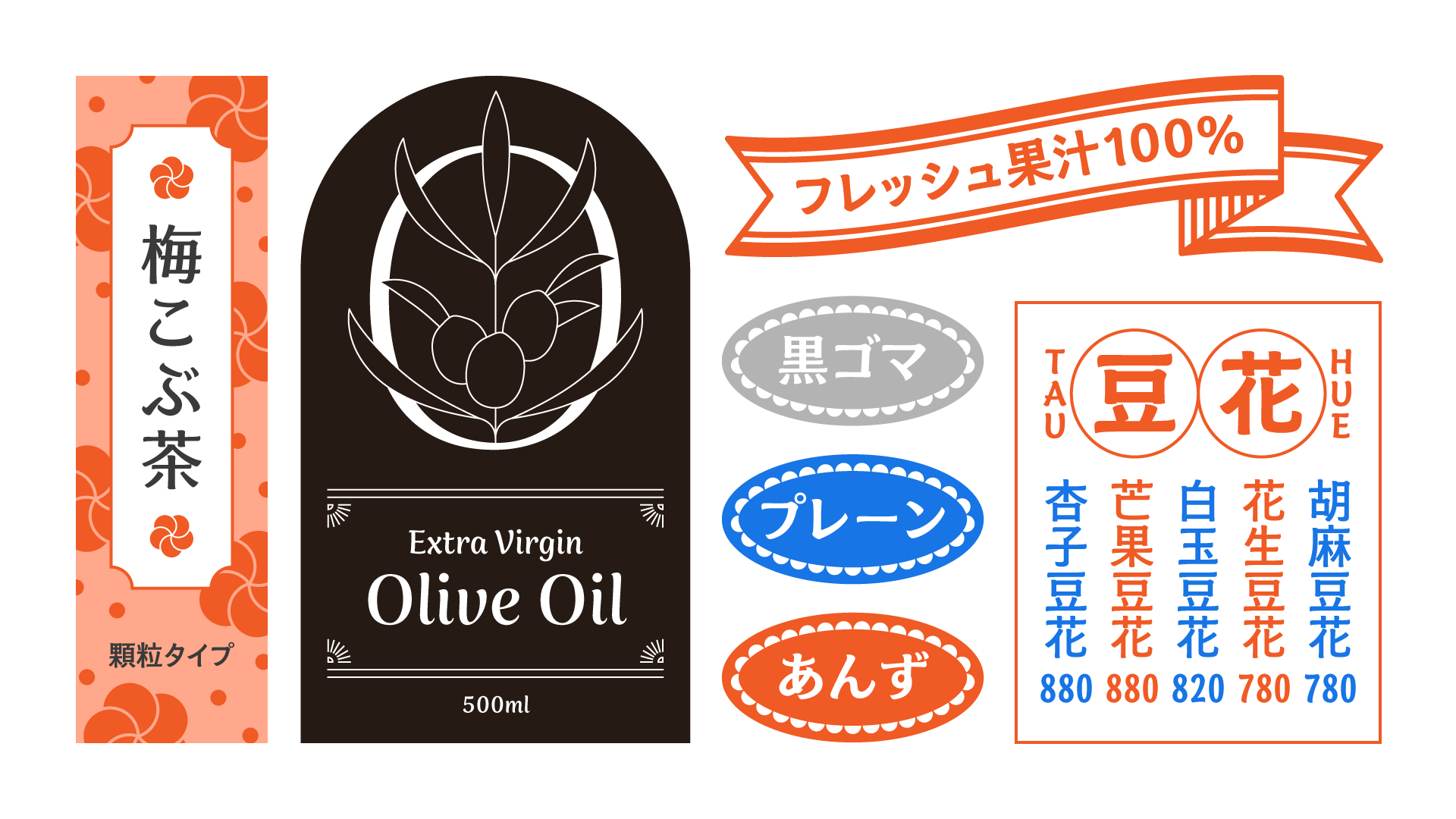 TPアプリコットは、食品や飲料のパッケージでの使用を想定して開発しました。フレッシュさ、みずみずしさ、口当たりの良さ、クリーミーさ、甘さ、まろやかさなど、美味しさを感じさせる表現を得意としています。細部のデザインにはこれらのニュアンスを取り入れつつ、骨格や字面など文字の土台となる部分はスタンダードなバランスを保っています。そのため、パッケージや広告画像といった限られたスペースでも安定感のある文字組みが可能です。ロゴからキャッチコピーまで、食にまつわる多彩なテキストを豊かに表現できる書体です。