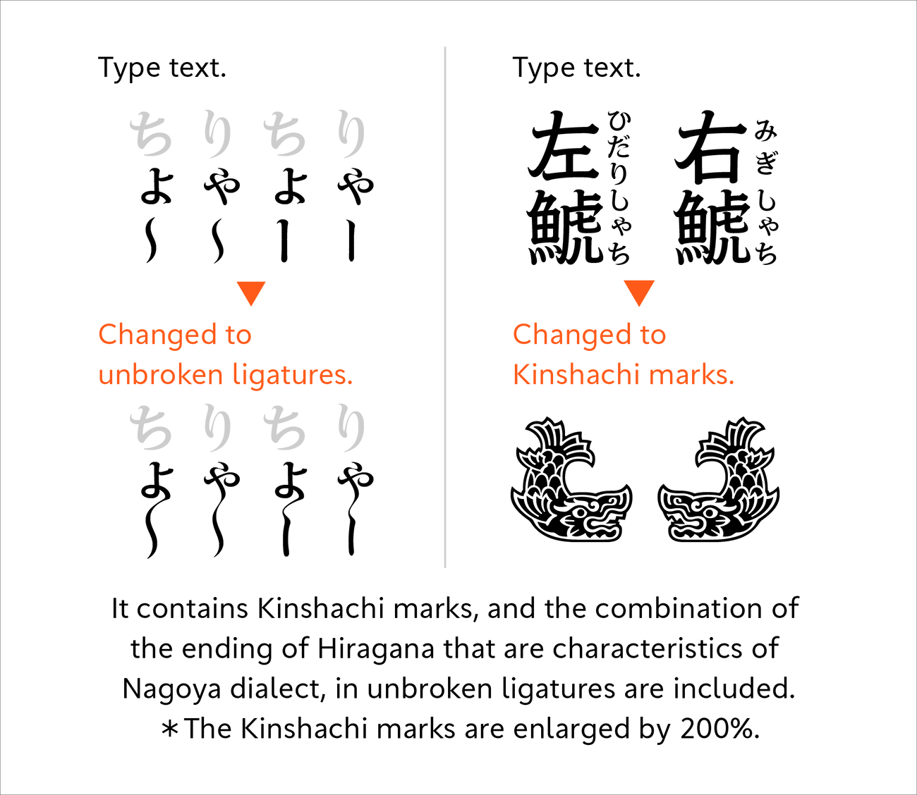 Utilization of region-specific cultural resources in typeface design – this is the basic way of thinking carried out for the City Font Concepts advocated by Type Project. The City Font Concepts are concepts that represent the identity of a city by incorporating the individuality and charm of a city into the font design. The prototype for Kinshachi Font was introduced in 2010, the year marking 400 years since the founding of the city of Nagoya as a seat of government.