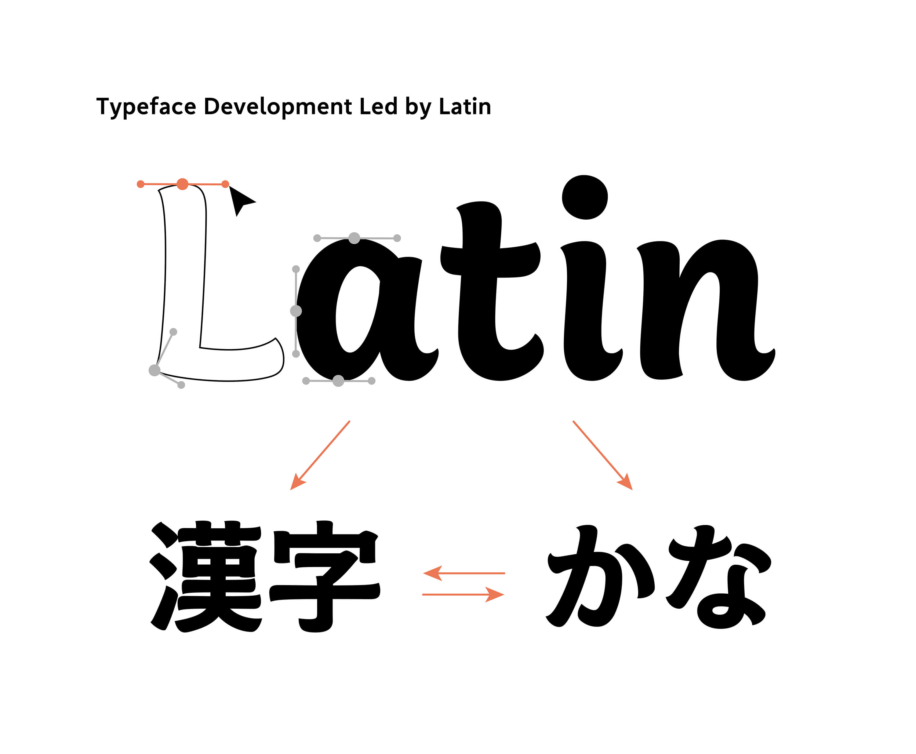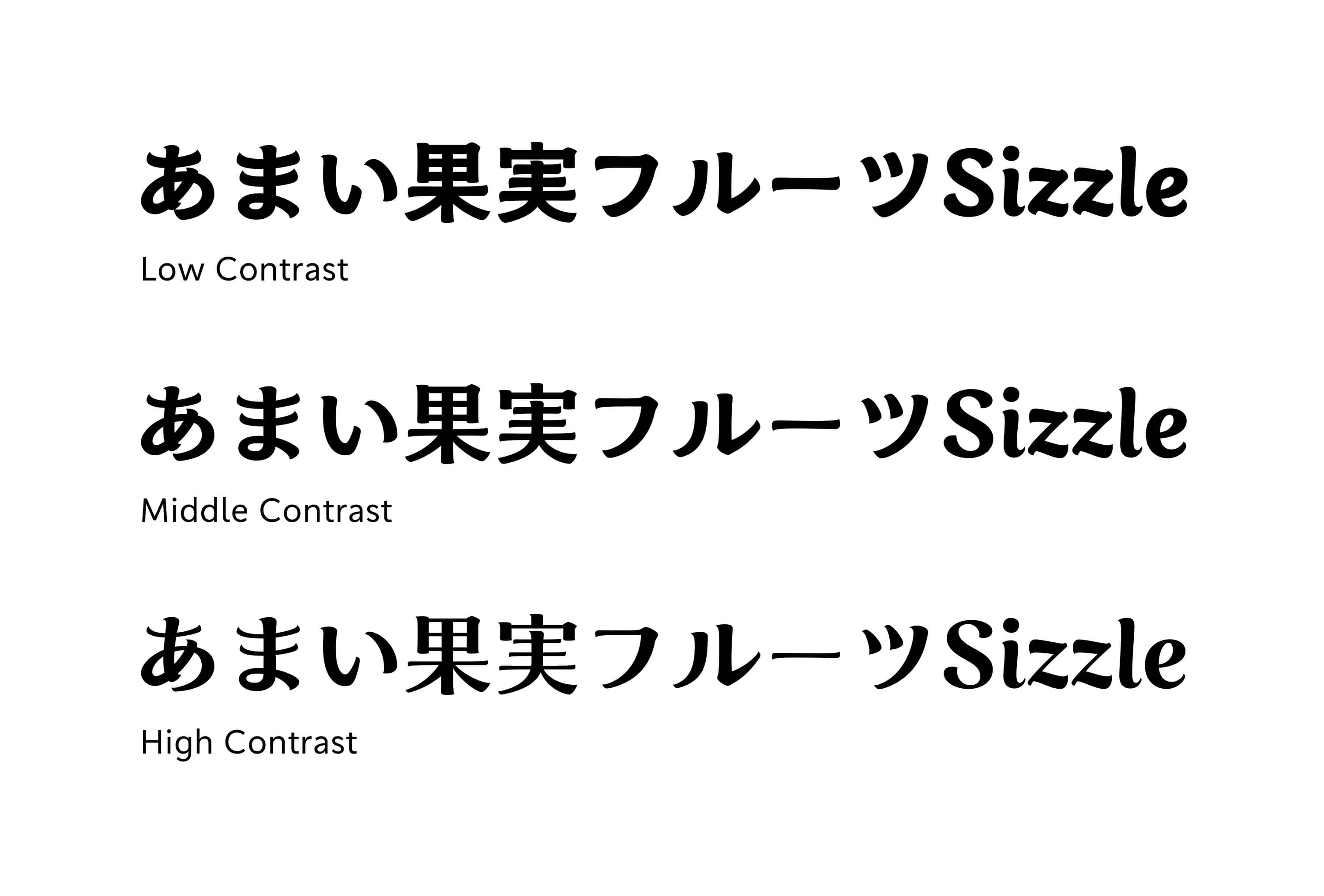 First, let’s check the basics of how to harmonize the designs of three different scripts: Latin, kana, and kanji. Increase the size gradually in the order of Latin, kana, and kanji, while decreasing the stroke thickness gradually in the same order of Latin, kana, and kanji. This makes the overall blackness appear consistent, from Latin with its few strokes to kanji with many strokes.