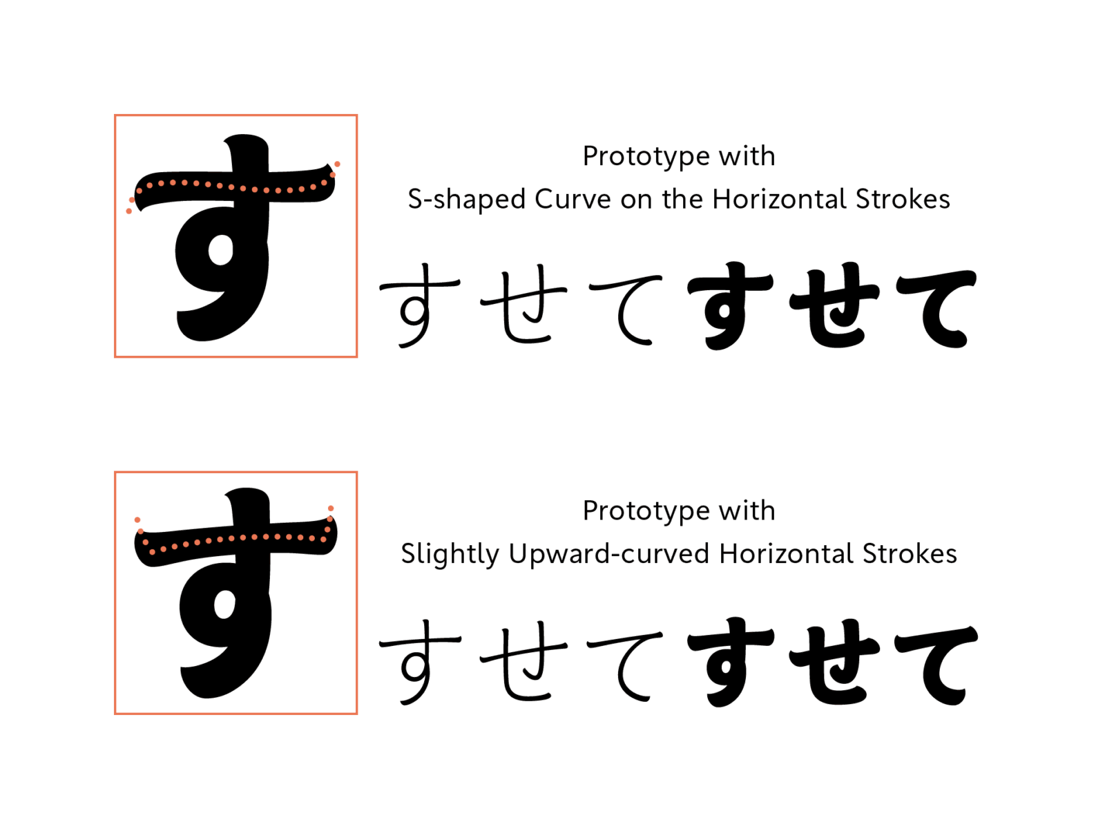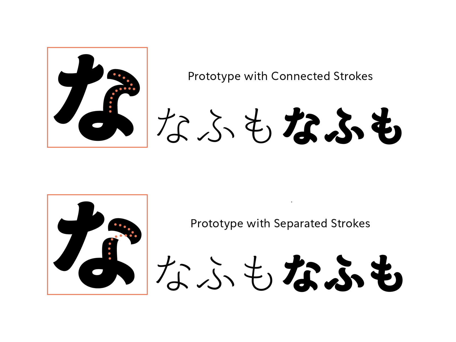 When creating the hiragana, we tried connecting and separating strokes, adding S-shaped curves to longer horizontal strokes, and comparing various prototypes before arriving at the final design.