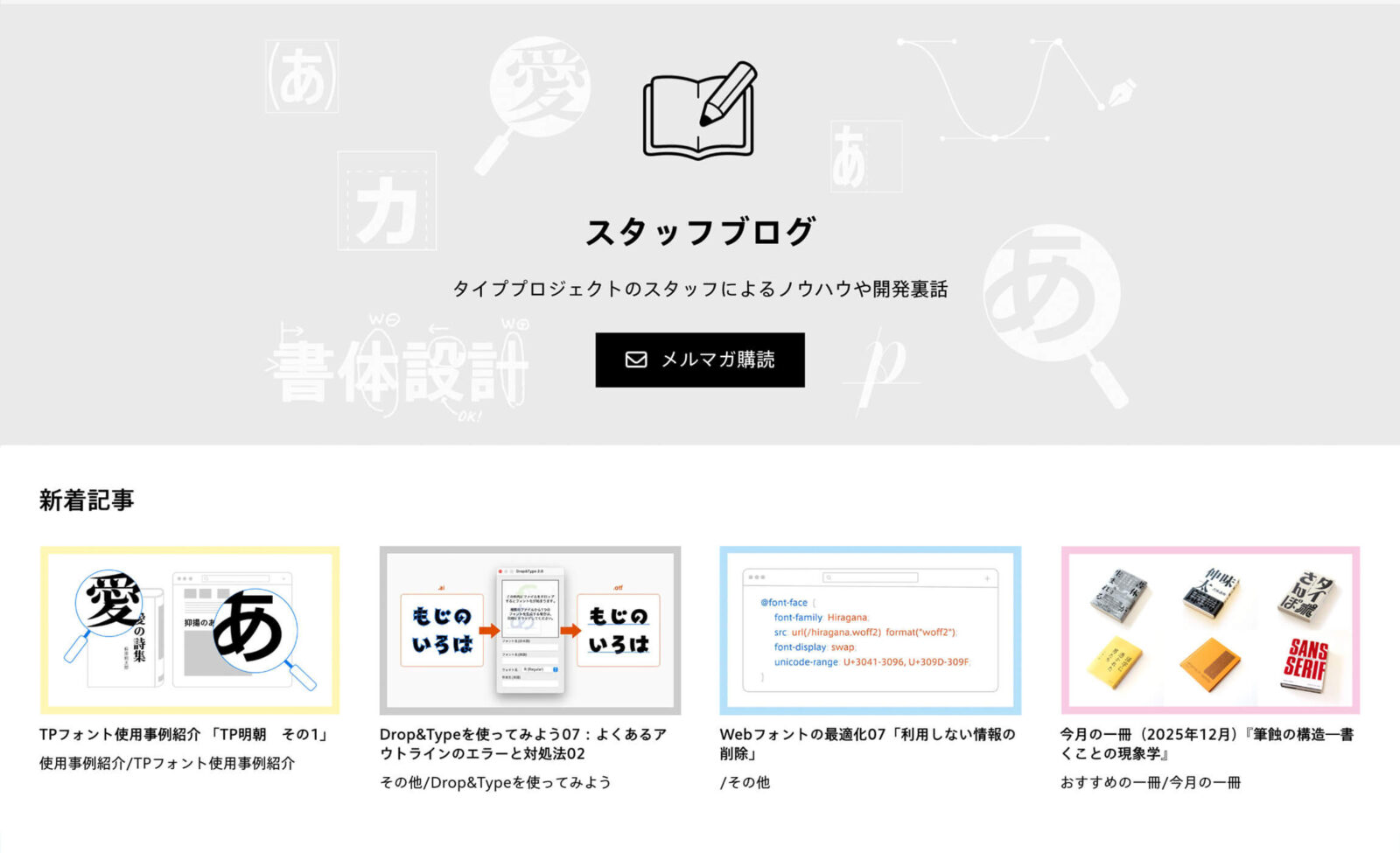 タイププロジェクトでは、2021年に開始したスタッフブログページのデザインをリニューアルいたしました。新着記事の一覧や各シリーズの概要説明などを追加し、より見やすく、検索性の高いページ構成になりました。今後も、書体デザインに関わるさまざまなトピックをスタッフ目線でお届けします。